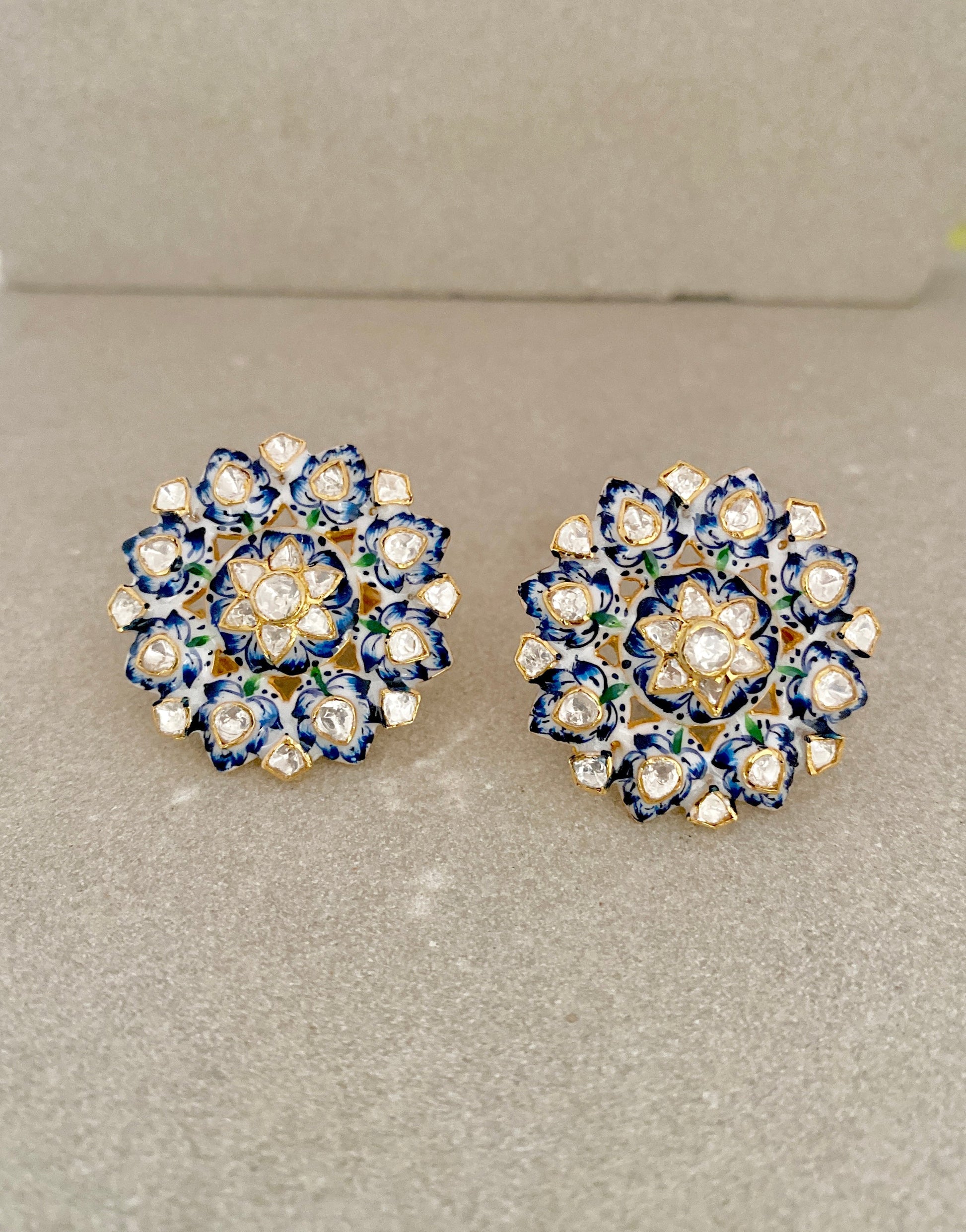Handcrafted Blue Fern Polki Stud Earrings - 925 Silver Gold Plated