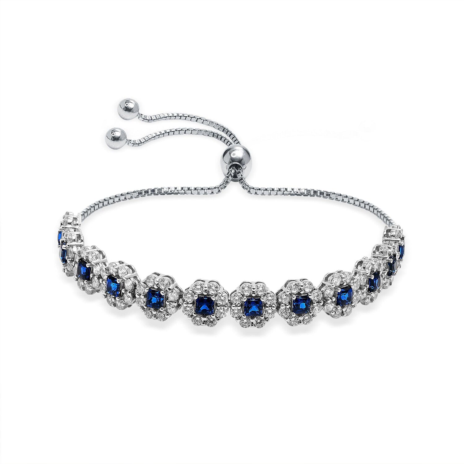 925 Sterling Silver Tennis Round Cubic Zirconia & Blue Sapphire Adjustable Bolo Bracelet for Women
